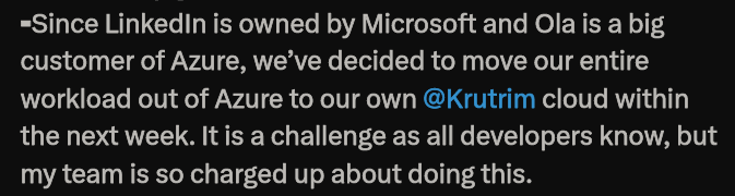 All this big talk about moving away from @Microsoft @Azure within a week for this most bullshit-iest of reasons when Ola's workload is primarily on @awscloud .