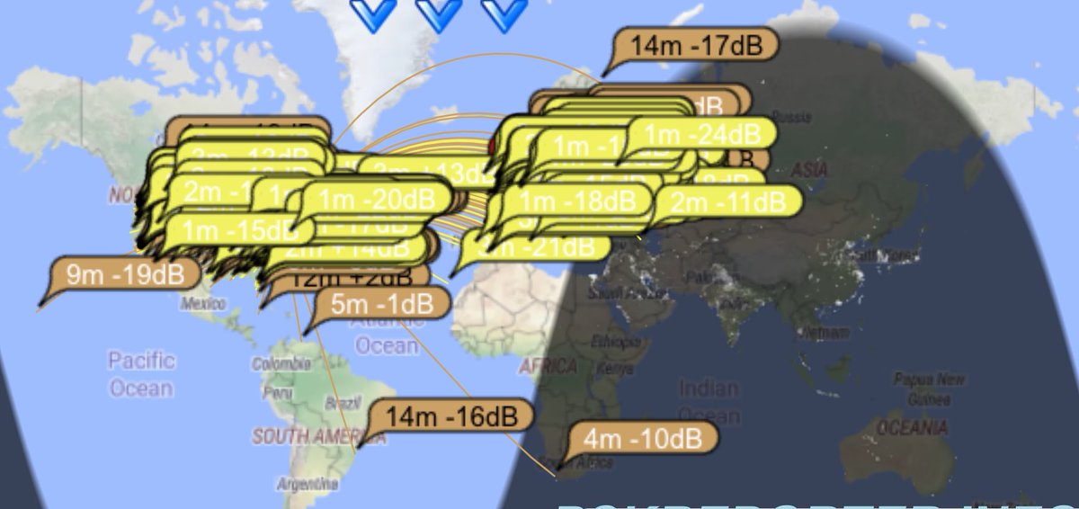 Here’s my reach with 100 watts and a 100 foot antenna strung from a tall tree in Massachusetts last week.