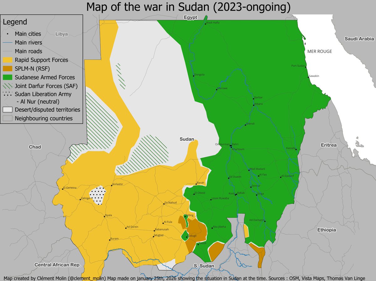 🔹War in Darfur and Kordofan since 2003 (rise of Janjawid militias, today RSF) between Khartoum and non-arab ethnicities
