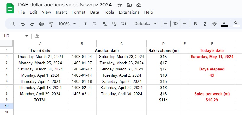 The average inflow since Nowruz—remember, these are dollars that get delivered to the aid agencies, sold to DAB and then resold at auction—has been just over $16 million per week.