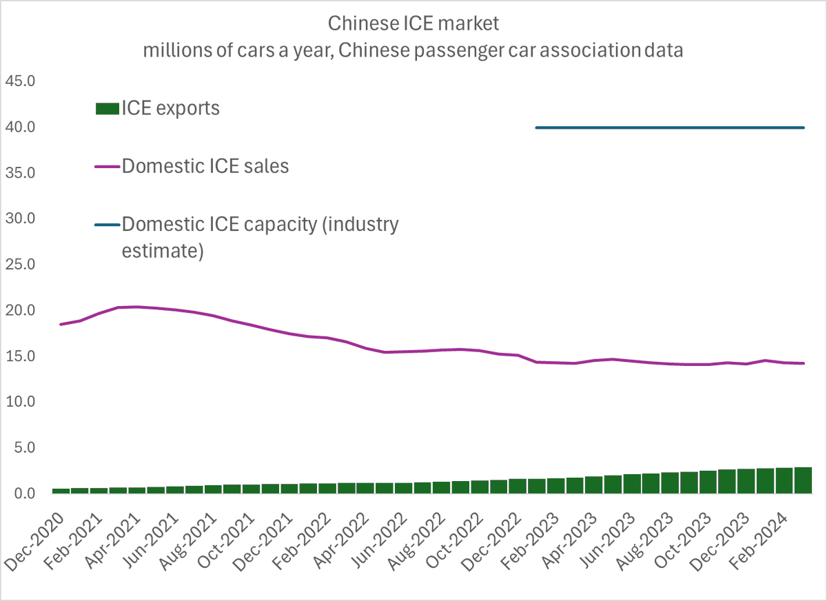 EVs tend to get all the attention. But the bulk of China's vehicle exports are traditional internal combustion engine cars. And that is where the is clear overcapacity (WSJ reports 40 m in capacity v 15m and falling domestic sales)
