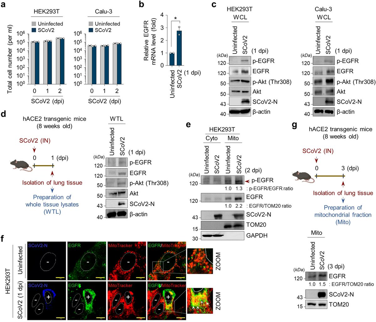 SARS-CoV-2 activates the EGFR signaling pathway and induces mitochondrial translocation of EGFR.
