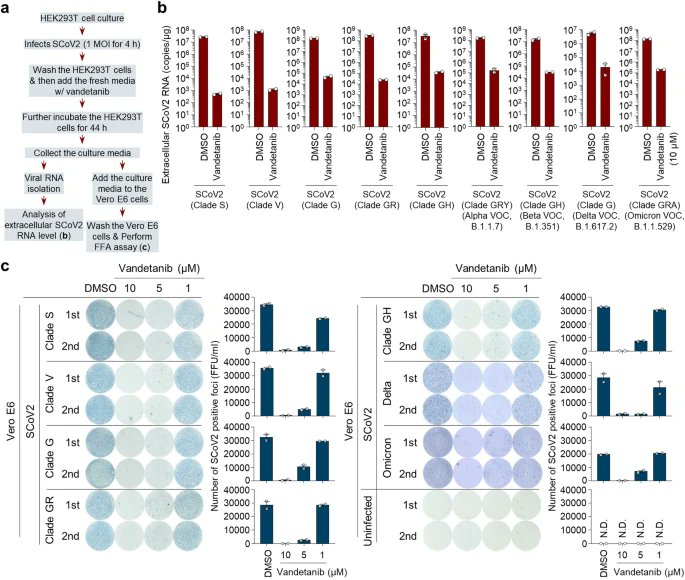 Vandetanib demonstrates potent antiviral activity in vitro against various SARS-CoV-2 variants including Alpha, Beta, Delta and Omicron.