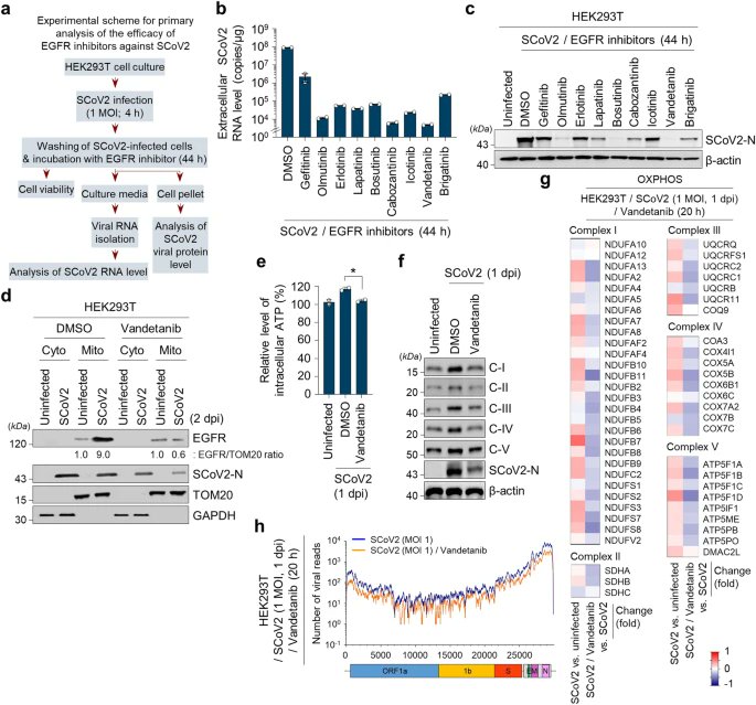 Treatment with FDA-approved EGFR inhibitors, especially vandetanib, reduces SARS-CoV-2 replication by inhibiting mitochondrial EGFR translocation and restoring mitochondrial function.