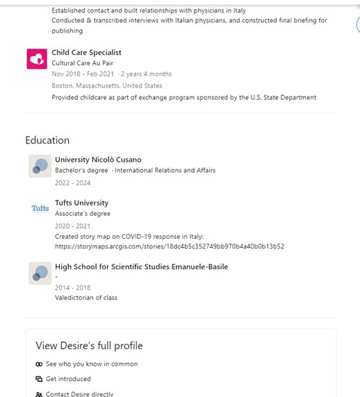 An associate's degree at Tufts University, a bachelor's degree at University Nicolò Cusano in Rome. linkedin.com/in/desire-del-…
