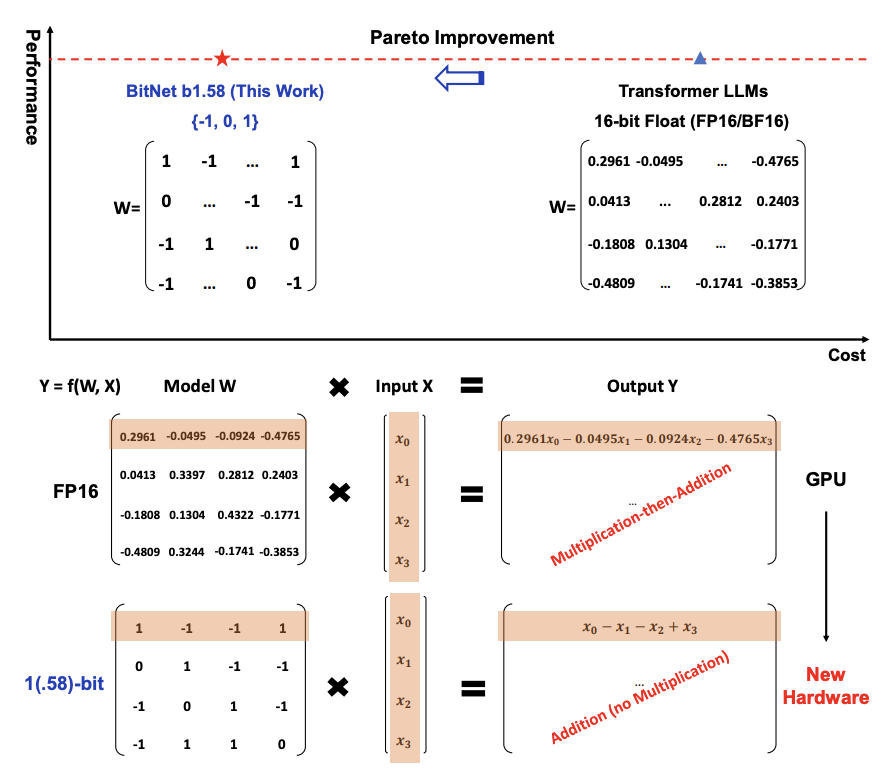 Figure 1: 1-bit LLMs (e.g., BitNet b1.58) provide a Pareto solution to reduce inference cost (latency, throughput, and energy) of LLMs while maintaining model performance. The new computation paradigm of BitNet b1.58 calls for actions to design new hardware optimized for 1-bit LLMs.