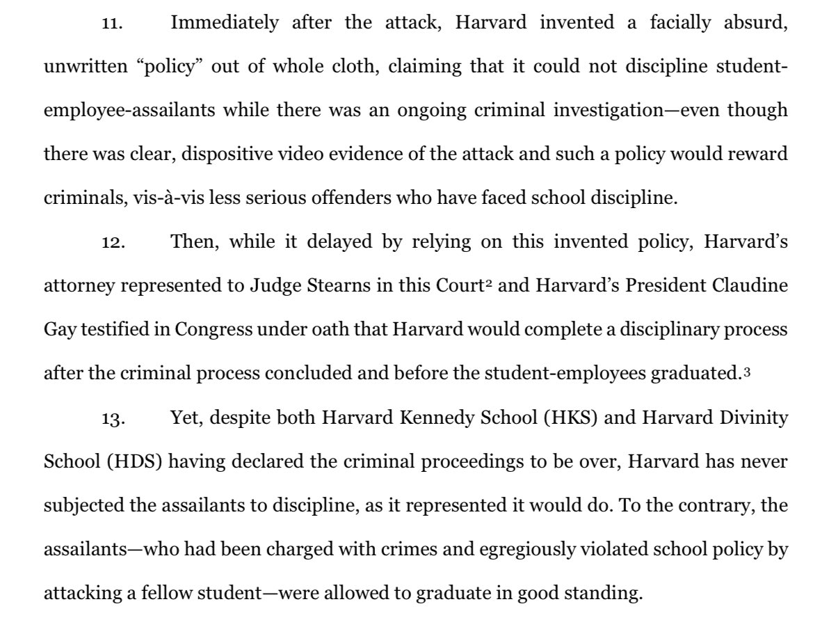 He says “Harvard did everything it could to defend, protect, and reward the assailants; to impede the criminal investigation; and to prevent [him] from obtaining administrative relief from the University.”