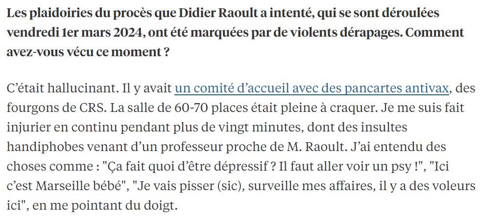 2/ Je vous invite à lire d'abord le récit du procès en première instance intenté par Didier Raoult contre moi. Avec injures de Didier Raoult, menaces contre ma témoin et moi, les gens qui montent sur les bancs... (mon avocat n'avait jamais vu ça).🔽