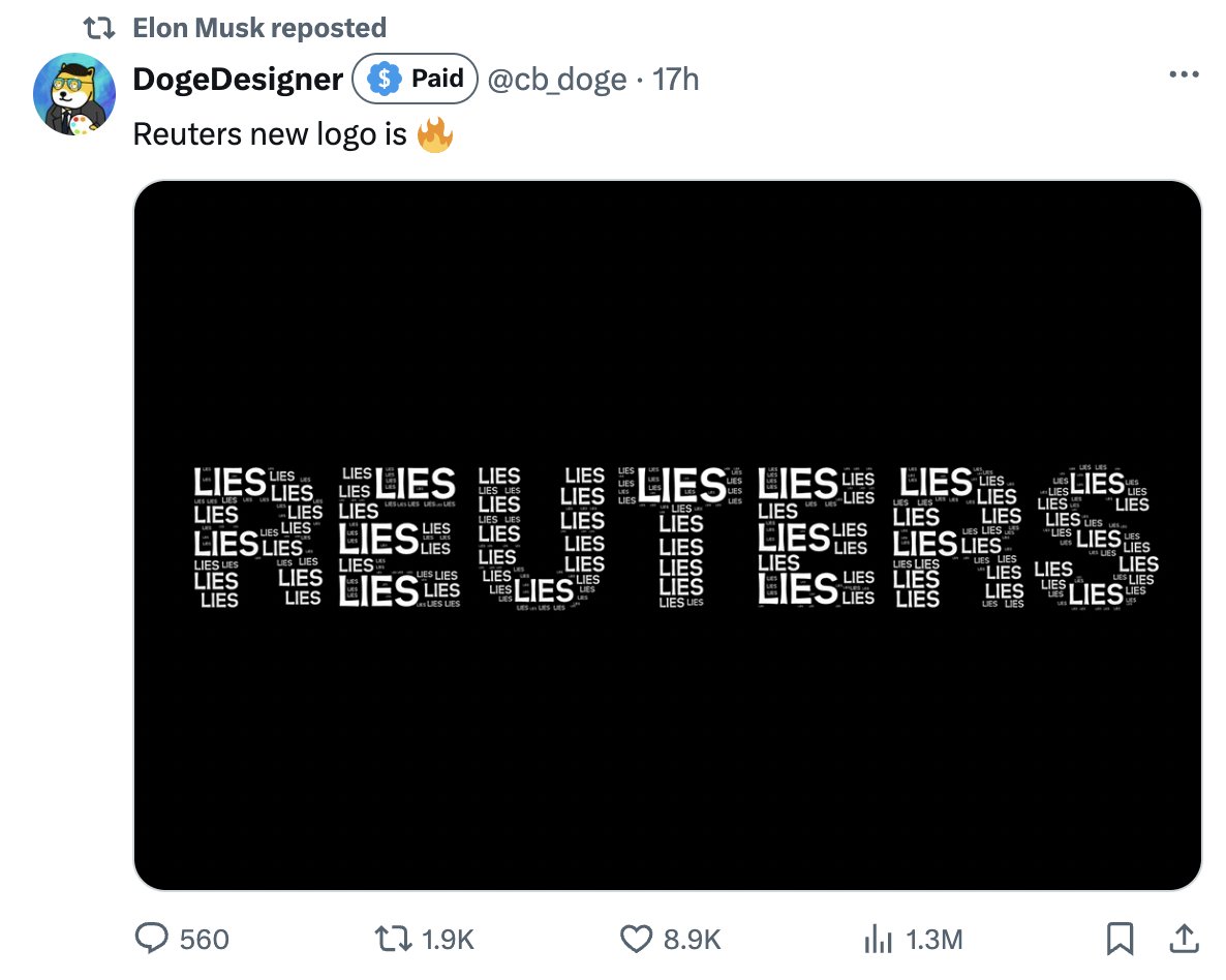 (THREAD) It’s important that everyone RETWEET this thread. As some of you know, Elon Musk has been on a deranged tear trying to destroy one of the most reliable news sources in the world, REUTERS. The recent reports in this thread are the ones Musk doesn’t want *anyone* to share.