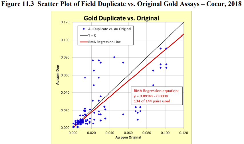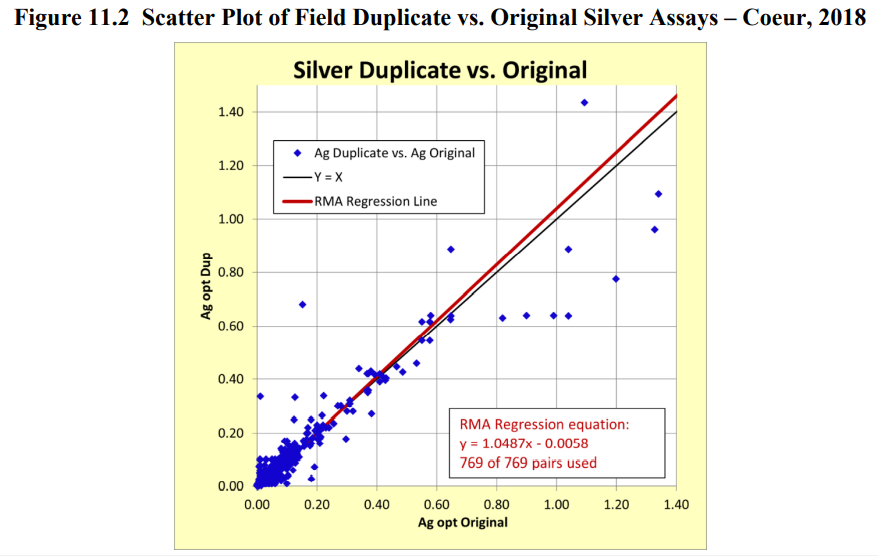 Let's start with the duplicate assays done by Coeur Mining $CDE, which clearly show grade variability over small distances and potential selection bias, as duplicate grades are more regularly below original grades than being above the originals, esp. for higher grades