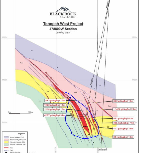 Now check out the Victor vein cross-section on the website vs. that in the tech report. Why are they not showing the drill results through their best vein in the tech report (circled in blue)