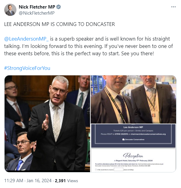 His speech was delivered in front of a backdrop plastered with Policy Exchange logos.