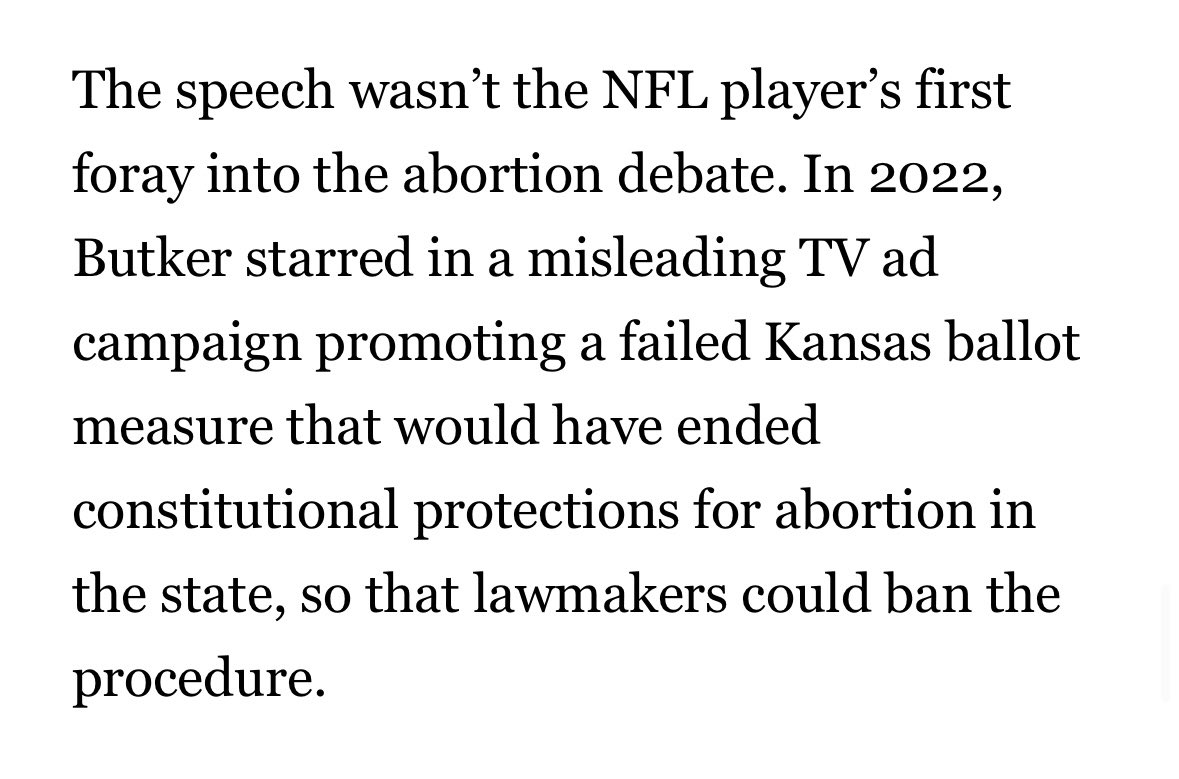 In 2022, Harrison Butker appeared in a misleading anti-choice political ad funded by CatholicVote Civic Action, which is bankrolled by Leonard Leo’s network, per journalists Andrew Perez & Nicki McCann. Butker’s recent speech whiffs of astroturf. 1/ Link: rollingstone.com/politics/polit…