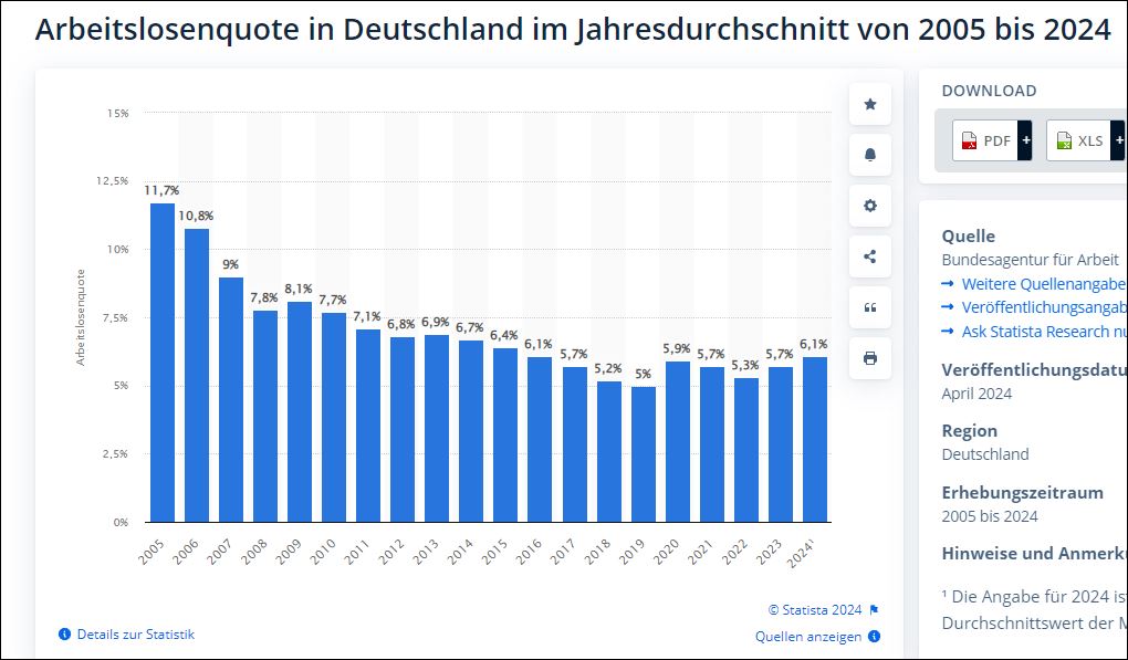 Die Arbeitslosenquote in Deutschland lag 2023 im Ø bei 5,7% (die 6,1% Januar bis April 2024 verzerren das Bild, da die traditionell schlechten Wintermonate dabei überrepräsentiert sind)
