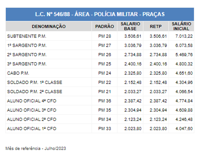 Este é o quadro salarial da Polícia Militar do Estado de São Paulo no que se refere aos Praças. +
