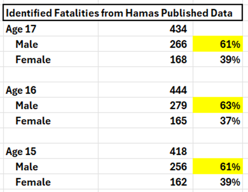 Male fatalities aged 15-17 are even higher at 62% (801 males vs 495 females) which is statistically impossible if there was really “indiscriminate” bombing and random attacks in Gaza. In fact, Hamas uses teen soldiers who are then legally targeted by IDF as combatants. 2/