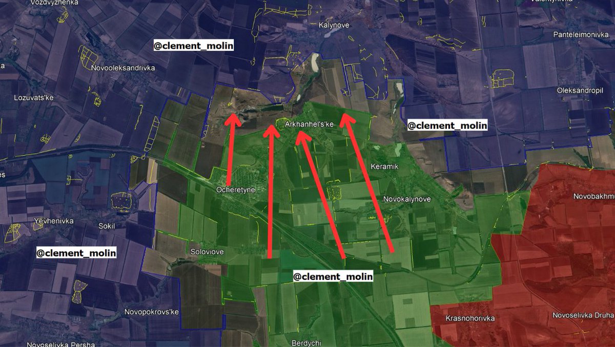 Le drapeau Russe flotte au nord du petit village d'Arkhanhelske, (48.270784 37.644632 / via @Suriyakmaps) prouvant une avancée de plus de 5 kilomètres depuis les positions d'il y a 2 semaines.