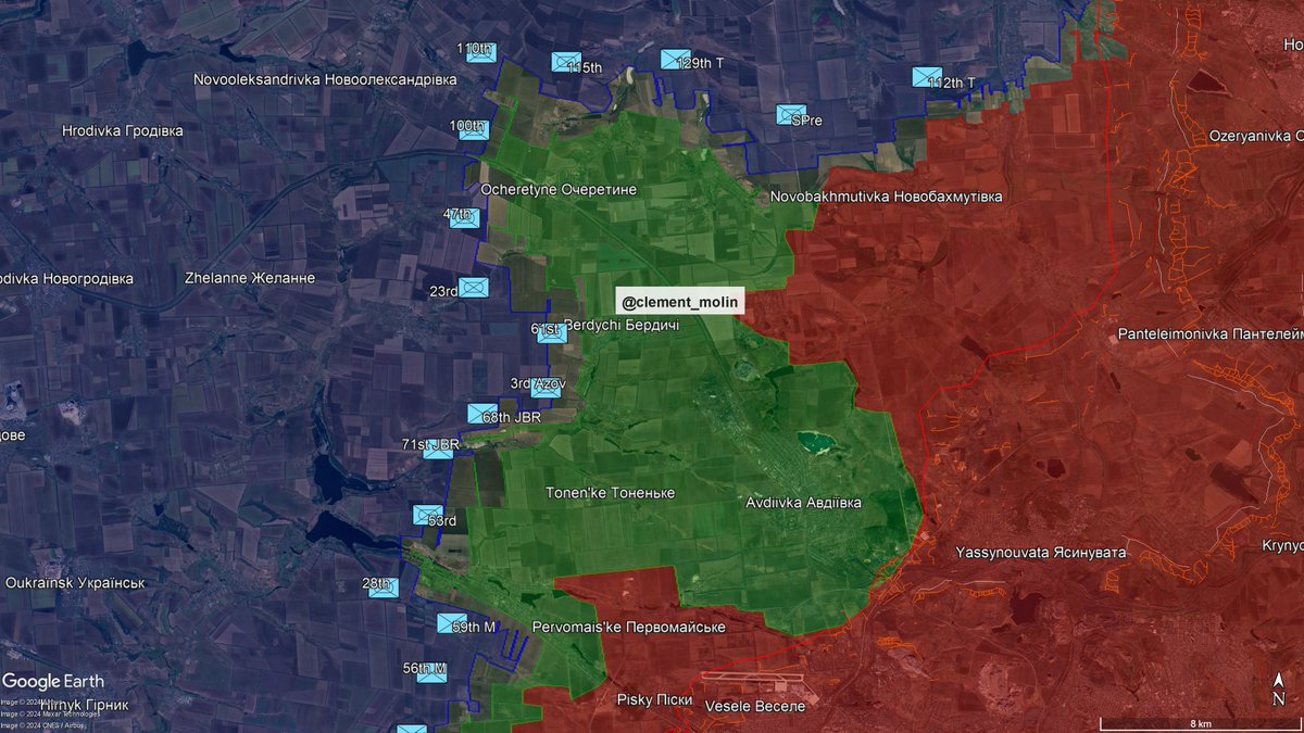 Dans l'axe d'Avdiivka, le village de Berdychi est finalement tombé aux mains des Russes après un probable retrait de la compagnie d'infanterie de la 47ème brigade mécanisée qui le tenait.