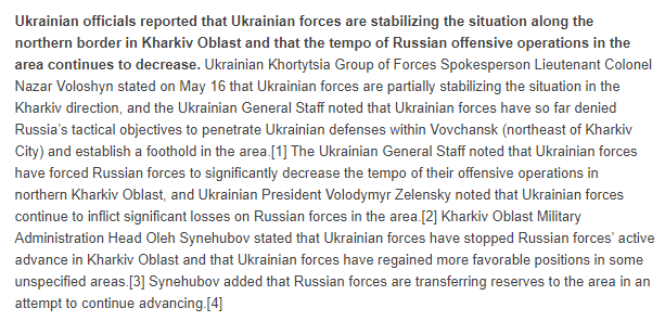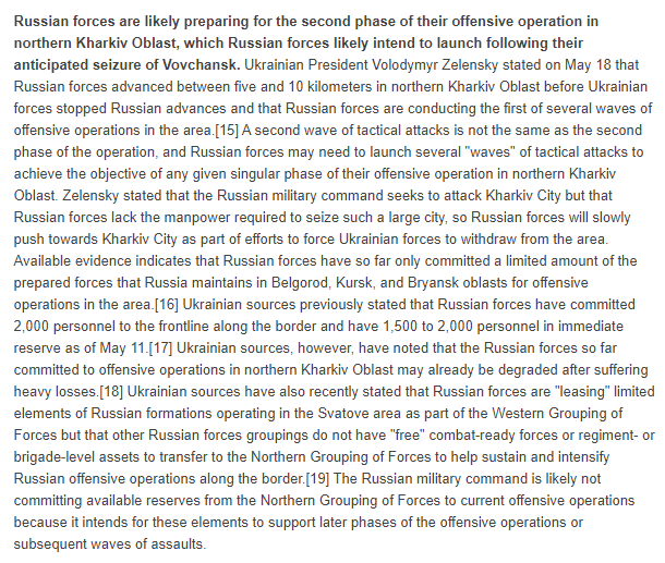 2/ Russian forces will likely be able to stretch Ukrainian forces along a wide front and fix Ukrainian troops in the international border area even as the tempo of Russian offensive operations in northern Kharkiv Oblast slows.