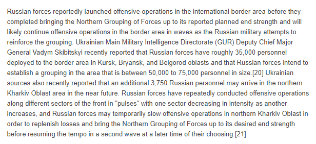 3/ Russian forces reportedly launched offensive operations in the international border area before they completed bringing the Northern Grouping of Forces up to its reported planned end strength and will likely continue offensive operations in the border area in waves as the Russian military attempts to reinforce the grouping.