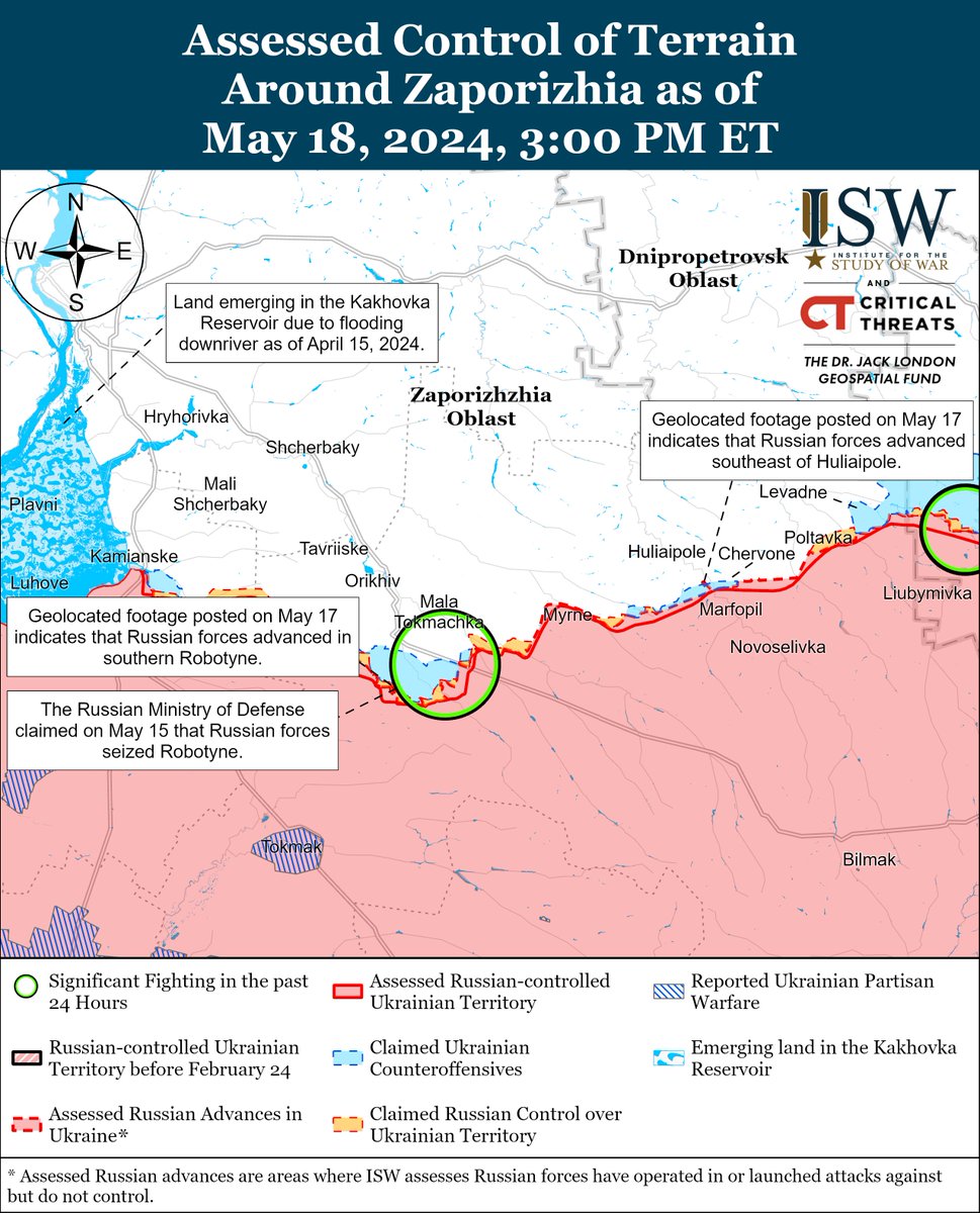 3/ Geolocated footage published on May 17 shows that Russian forces advanced north of Marfopil (southeast of Hulyaipole), and a Russian milblogger also claimed that Russian forces advanced in the area