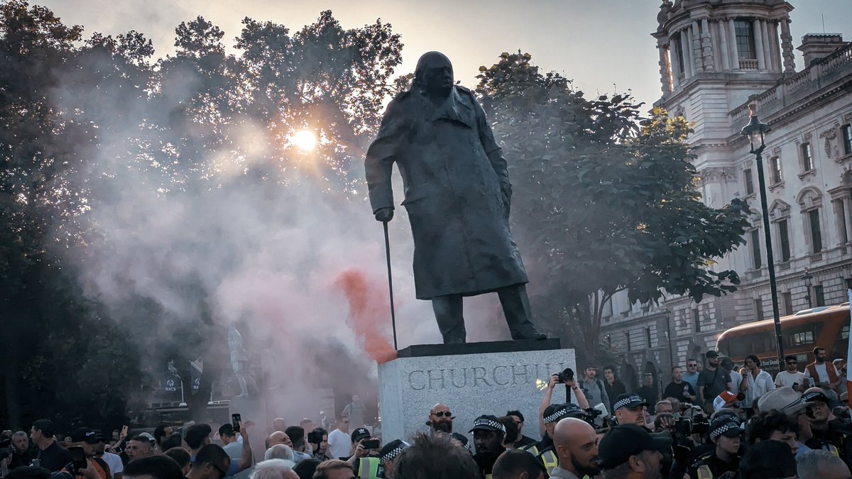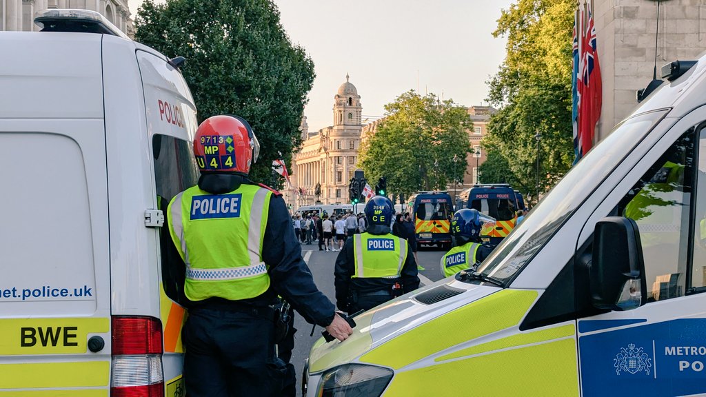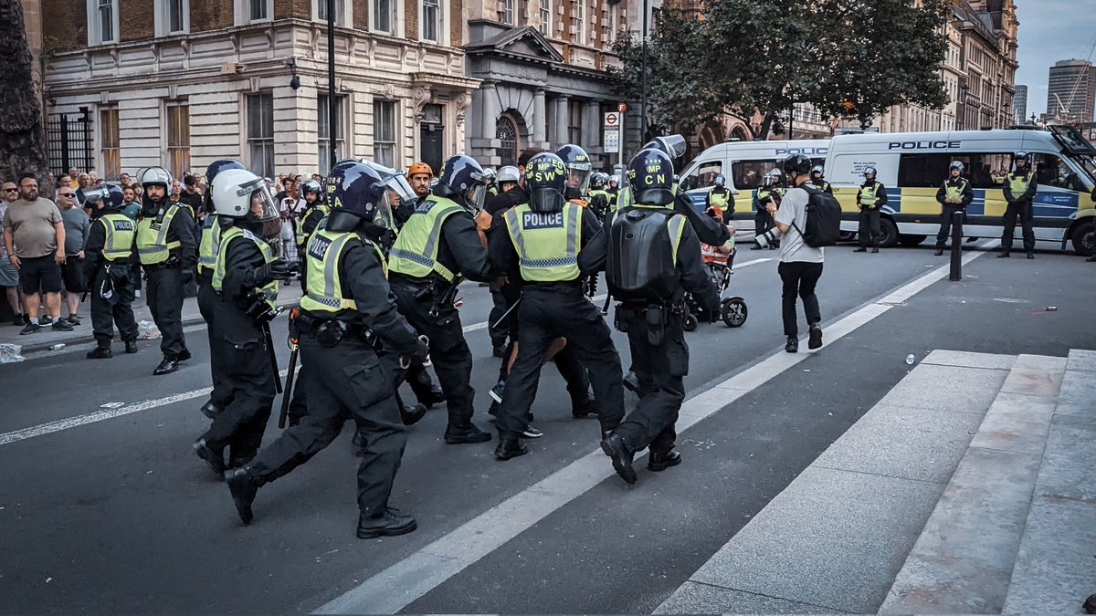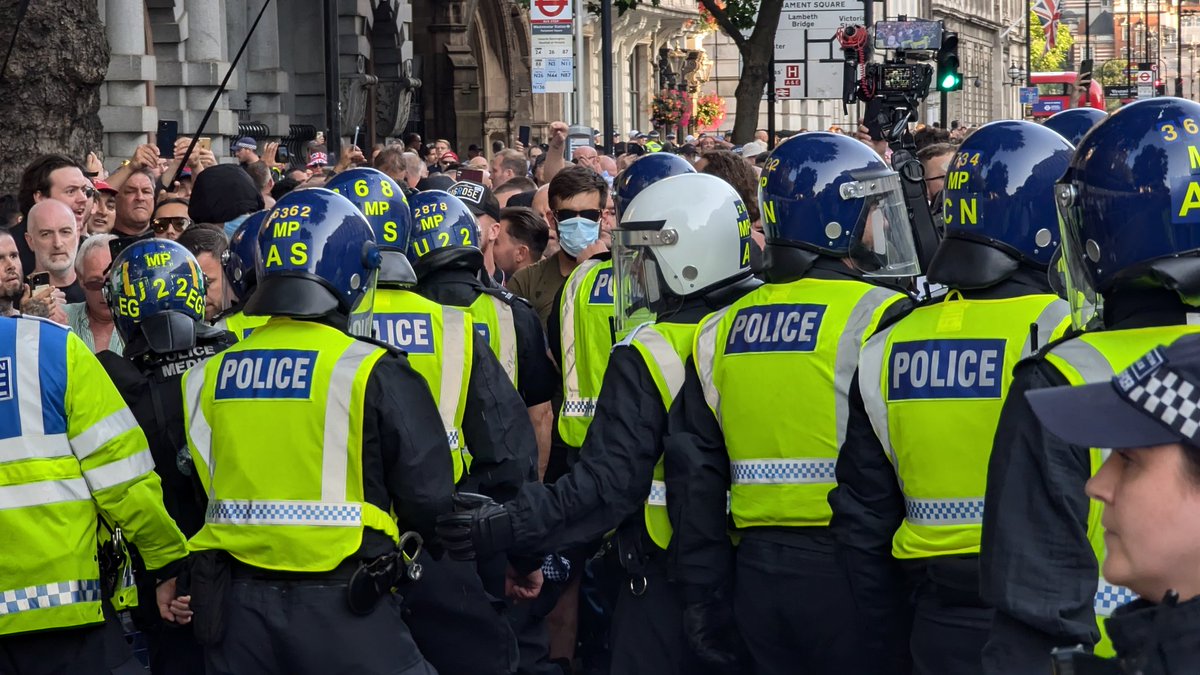 The protest became confrontational soon after, with chants of "You're not British anymore!" + "Where were you in Leeds?" directed at the police along Whitehall. There was a lot of racially charged chanting as well.