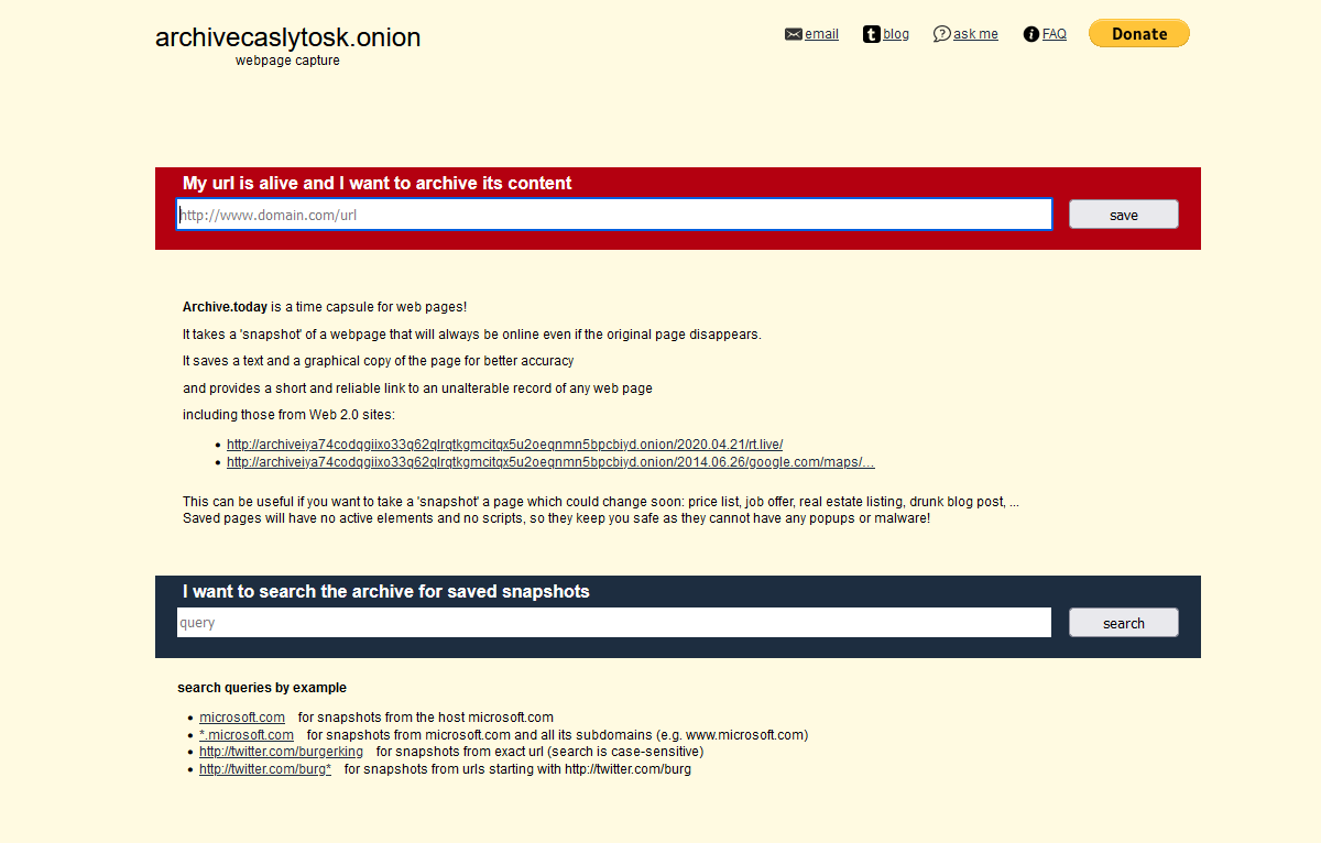 Archive Today is an on-demand webpage capture and storage service. If you’d like to request a capture anonymously, use its .onion version.