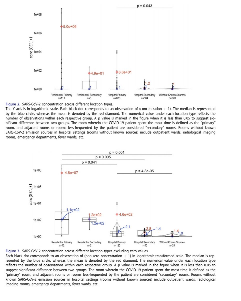 4) Within settings, primary rooms where patients spent most time had higher concentrations than secondary rooms visited less. However, virus detection was similarly likely in residential primary rooms. In hospitals, secondary areas like corridors less commonly tested positive.