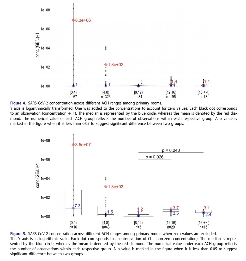 5) When grouped by ACH, virus concentrations and detection rates generally decreased as ACH increased from 0-12 changes per hour, Above 12, the trends were less clear possibly due to limited data.