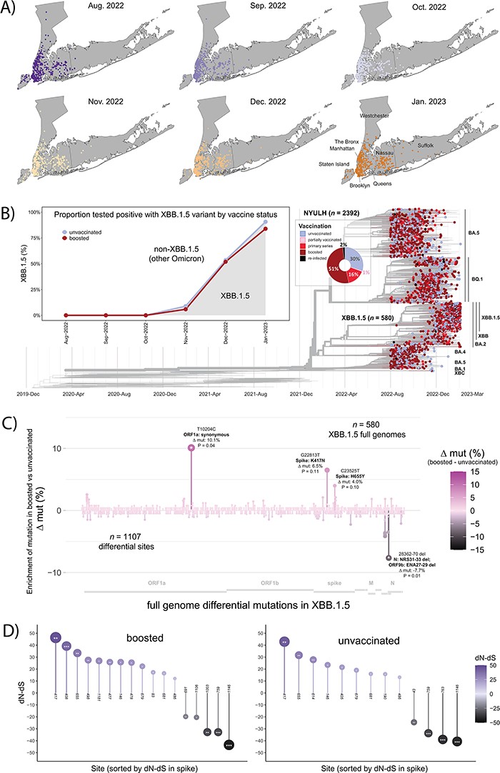 2) In this study, emergence and dissemination of SARS-CoV-2 XBB.1.5 variant in New York City was investigated. XBB.1.5 likely emerged in NYC based on one dominant lineage circulating since September 2022. Its prevalence increased similarly in boosted and unvaccinated individuals
