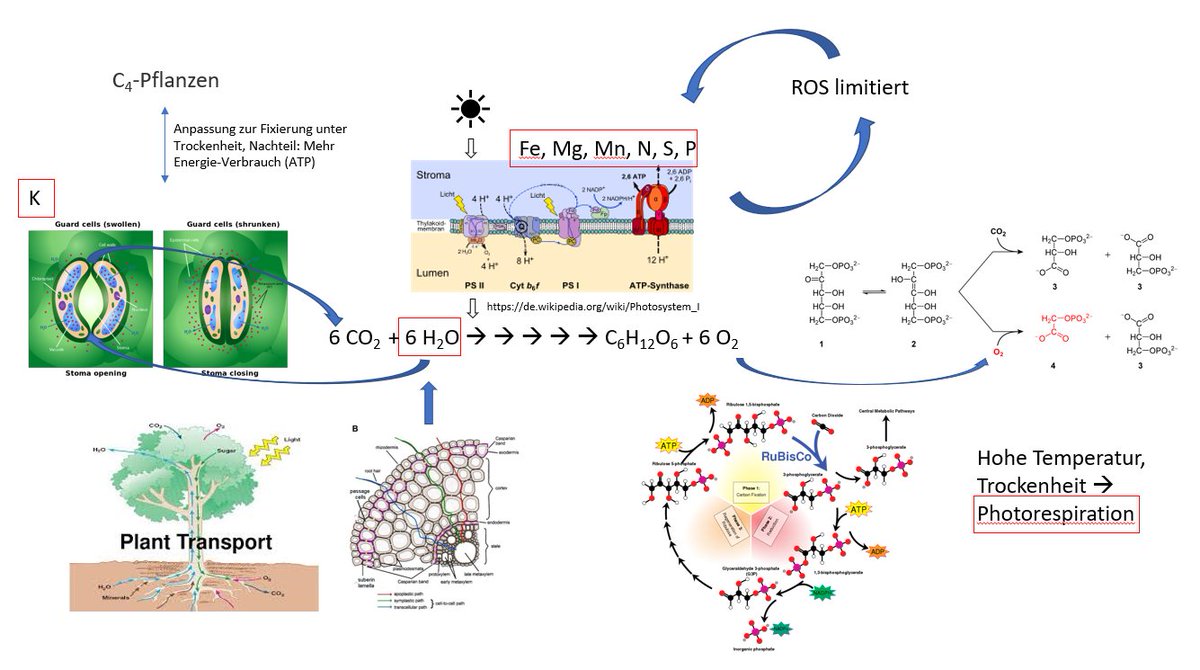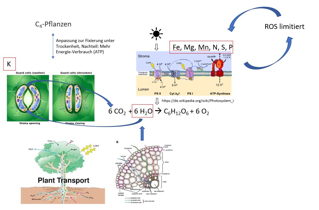 anfangen. Doch wo kommen Wasser und CO2 überhaupt her. Wasser wird in den Wurzeln aufgenommen und in die Blätter transportiert. In den Blättern werden Stomata geöffnet und das CO2 strömt in die Intrazellularen. Die Problematik der Pflanze ist, dass durch die geöffneten Stomata /7