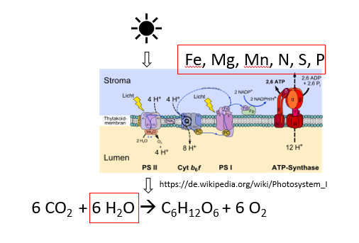 Nun könnte man sagen, dass wenigsten Wasserpflanzen/Algen zusätzliches CO2 quantitativ in Biomasse umsetzen sollten. Das ist ein Trugschluss, denn in den Ozeanen fehlt dazu genug Eisen. Dieses Fe wird aber bei der Umsetzung der Strahlungsenergie in chemische Energie und /4