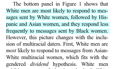 "White men are most likely to respond to messages sent by White women, followed by Hispanic and Asian women, and they respond less frequently to messages sent by Black women."