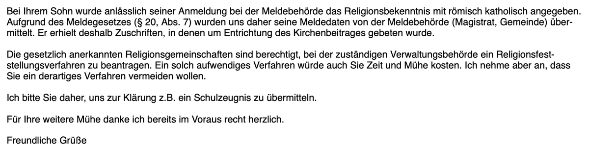 Kirche antwortet: "Ich habe die Daten korrigiert, den bisherigen Kirchenbeitrag storniert sowie das Beitragskonto Ihres Sohnes geschlossen – er wird keine weiteren Zuschriften erhalten." Erledigt.