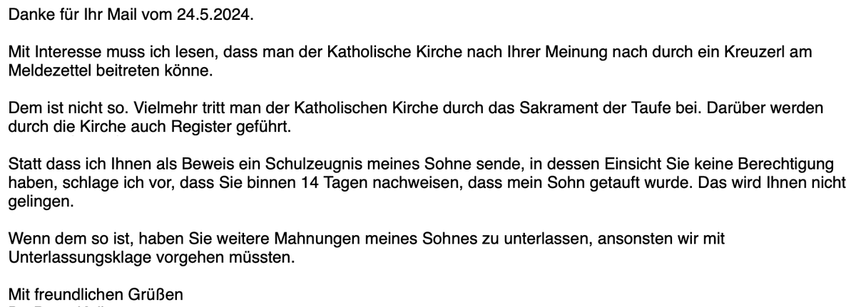 Die Katholische Kirche schreibt Jugendliche, die Großjährig werden an und fordert Kirchenbeitrag, egal ob diese getauft und damit Mitglieder der Kirche geworden sind oder nicht. Hier eine Antwort.