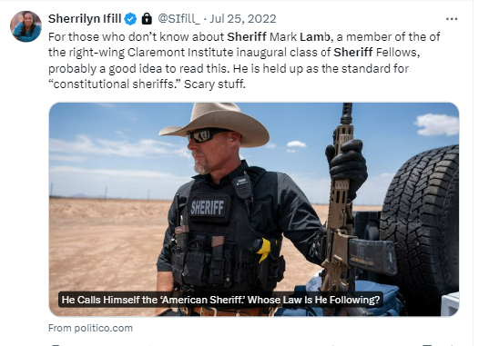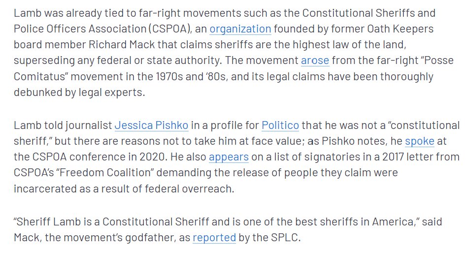 2/ Sheriff Mark Lamb is reportedly tied to the Constitutional Sheriffs and Police Officers Association (CSPOA). The CSPOA was "founded by former Oath Keepers board member Richard Mack" and "claims sheriffs are the highest law of the land, superseding any federal or state authority. The movement arose from the far-right “Posse Comitatus” movement in the 1970s and ‘80s, and its legal claims have been thoroughly debunked by legal experts." mediamatters.org/fox-news/arizo…
