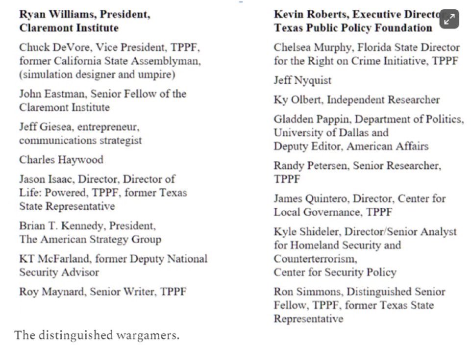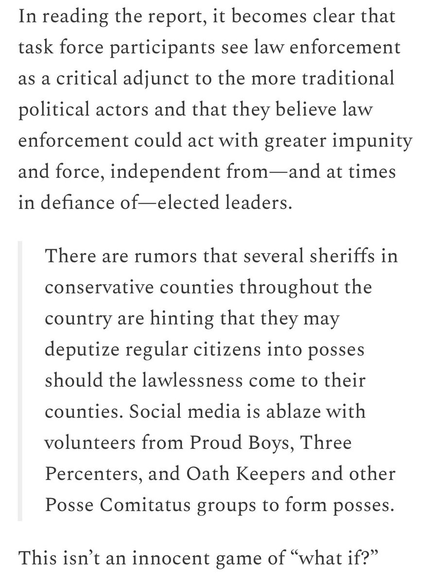 The Claremont Institute’s “79 days” report war gamed the 2020 election aftermath, including a scenario where sheriffs might “deputize regular citizens,” such as “Proud Boys, 3%ers, & Oath Keepers”, who wld form “posses” to stop anti-Trump “lawlessness” 1/ (Article from 11/18/21) thebulwark.com/p/notes-on-an-…