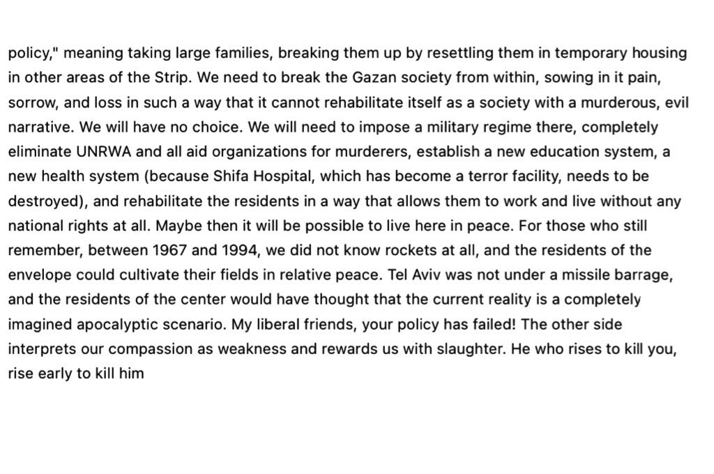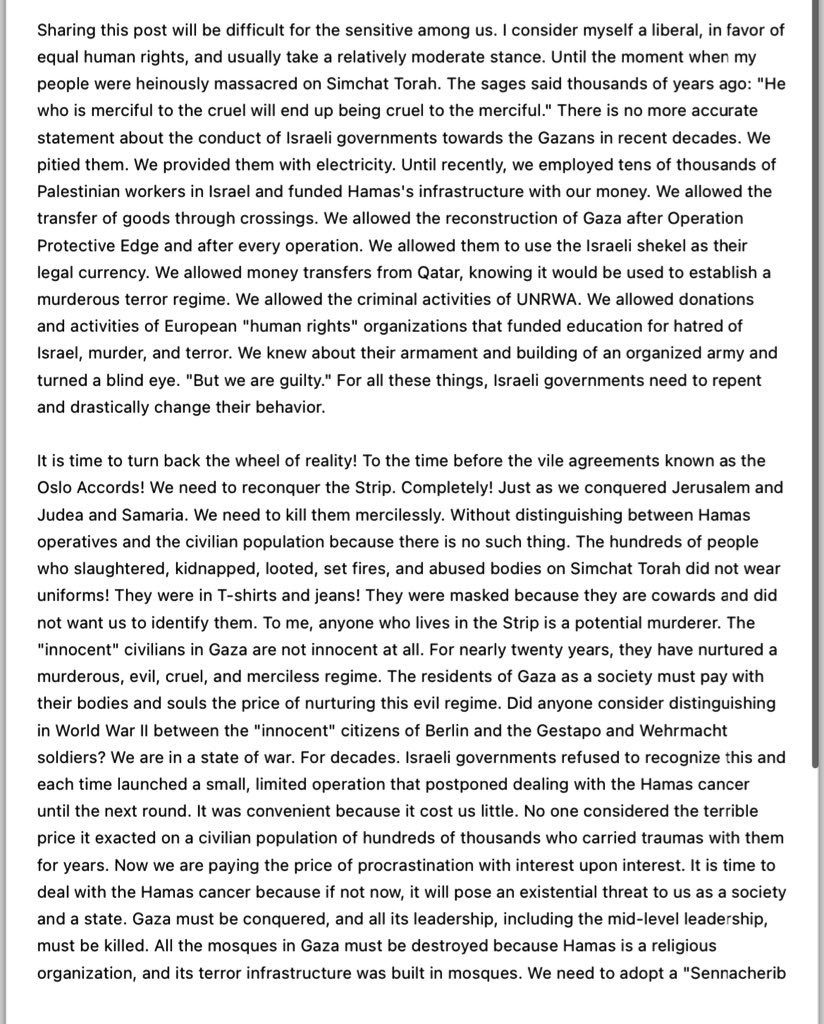 Also some excerpts: “I consider myself a liberal, in favor of equal human rights…. We need to kill them mercilessly. Without distinguishing between Hamas operatives and the civilian population because there is no such thing… To me, anyone who lives in the Strip is a potential murderer. The "innocent" civilians in Gaza are not innocent at all... The residents of Gaza as a society must pay with their bodies and souls the price of nurturing this evil regime. Gaza must be conquered, and all its leadership, including the mid-level leadership, must be killed. All the mosques in Gaza must be destroyed… We need to break the Gazan society from within, sowing in it pain, sorrow, and loss in such a way that it cannot rehabilitate itself as a society with a murderous, evil narrative. We will have no choice.“