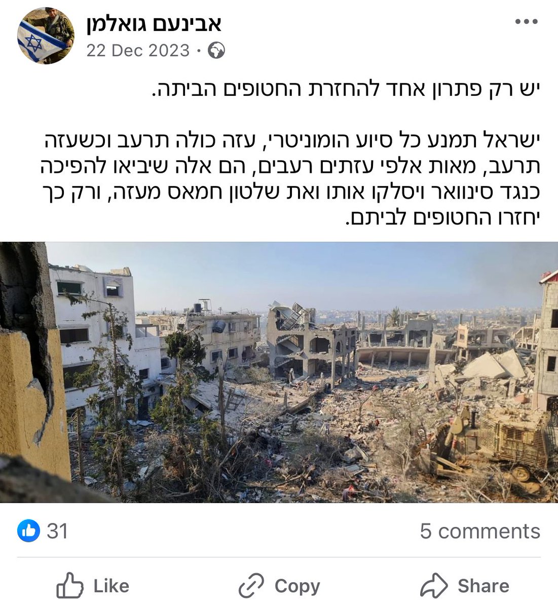 Major. Avinoam has fought in Gaza and taken several pictures among the pictures in Gaza. In the post above from 8. Oct he writes this (I translated to English) full post.
