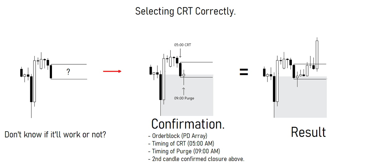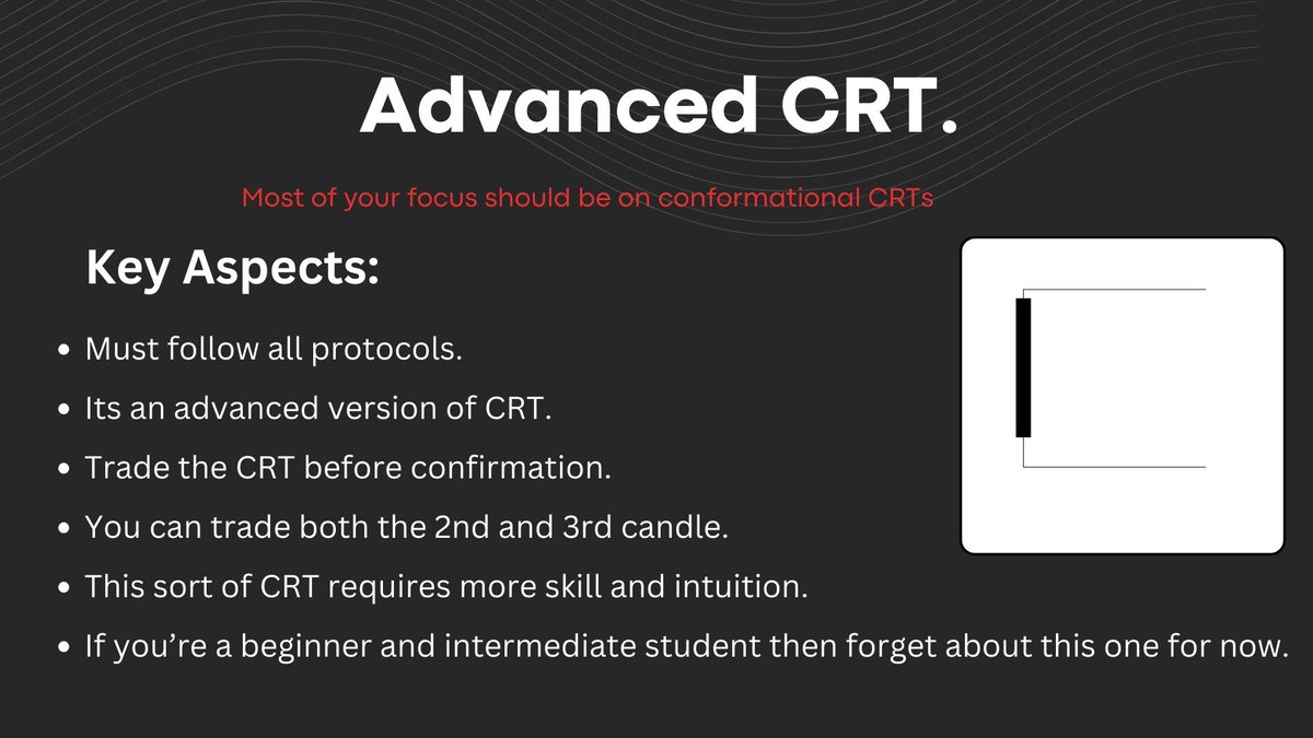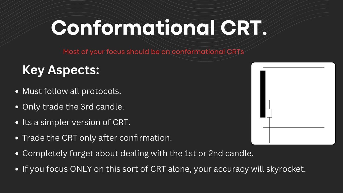 - To find conformational CRT, wait for the second candle to close, and then trade - the 3rd candle after the 2nd candle confirms the CRT.