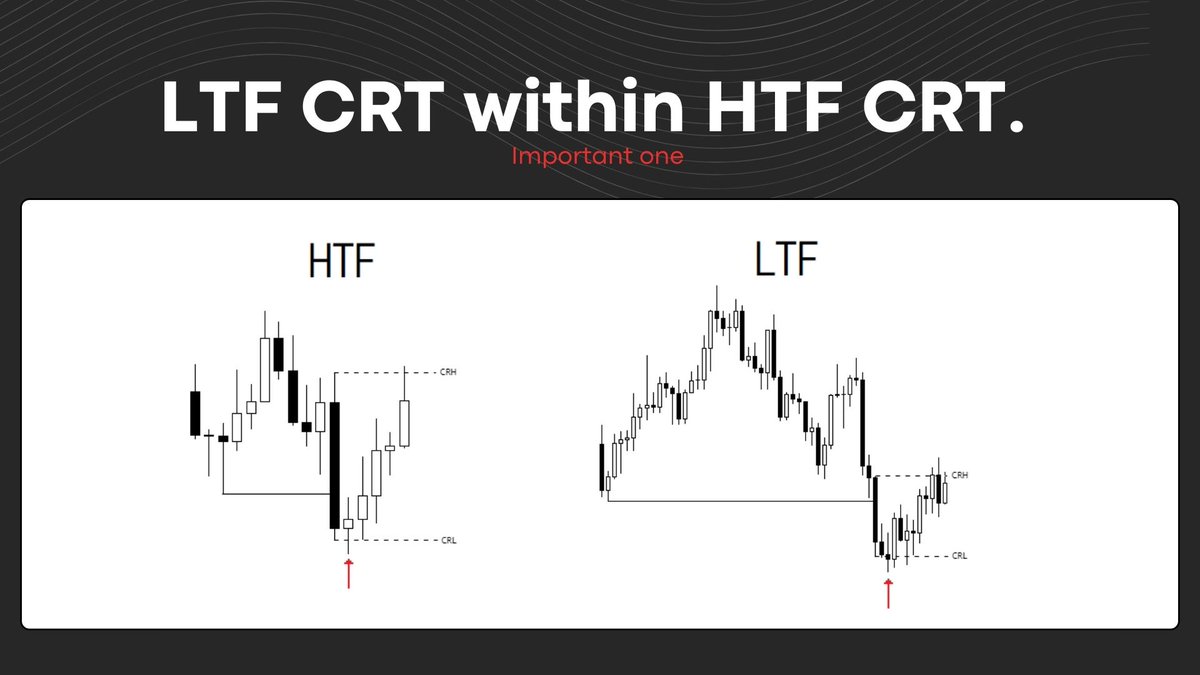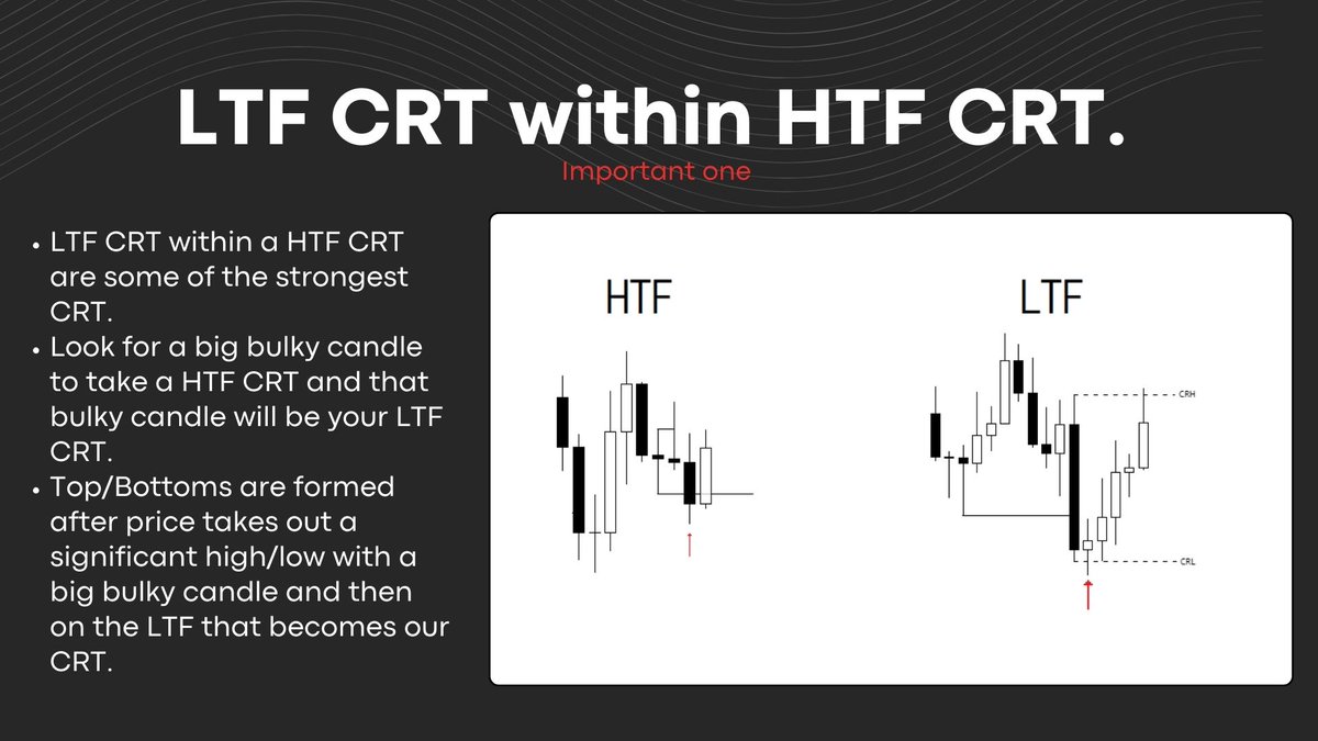 You wait for a big bulky candle on the LTF to confirm a HTF CRT, and then that candle becomes your LTF CRT, which you can trade on a further lower timeframe (LTF) using timeframe alignment.