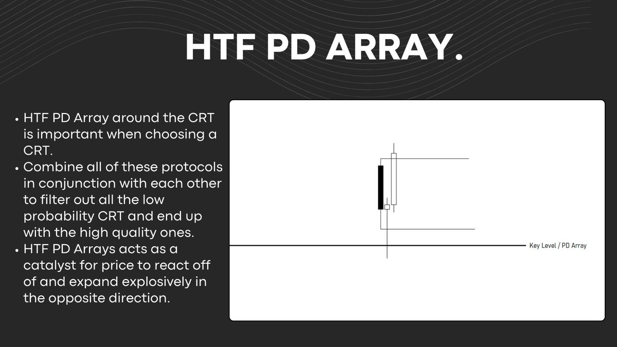 HTF PD array essentially acts as a catalyst for expansion. When one side of the CRT is purged and price tests a PD array, some of the most explosive expansions occur after price tests an indicative PD array.