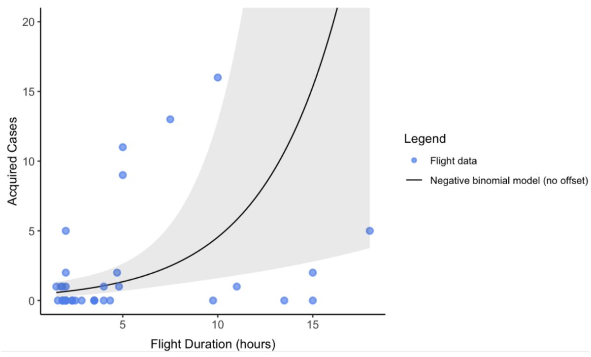 3) Medium flights had 4.66x higher incidence than short, and long flights 25.93x higher. Enforced masking on long flights prevented transmission. Each additional hour of unmasked flight corresponded to 53% higher transmission risk.