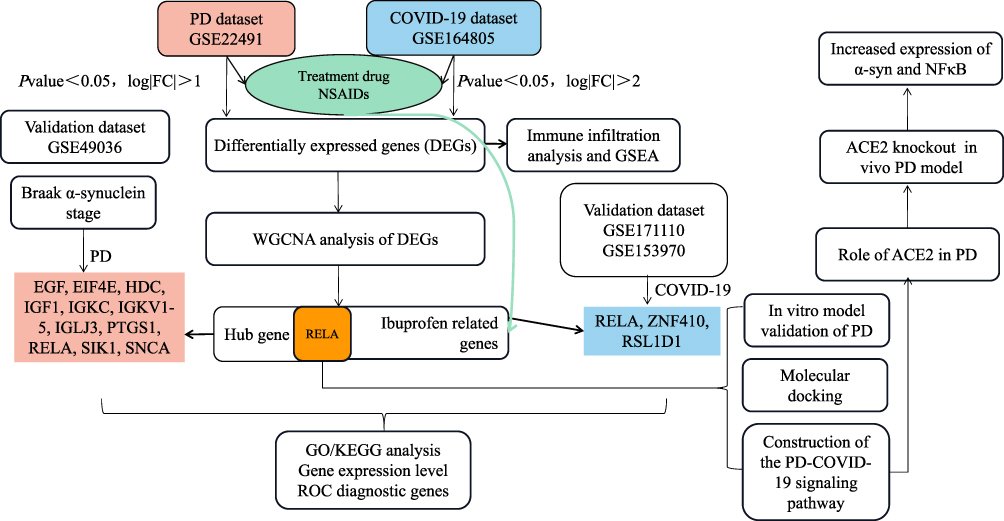 4) Ibuprofen may help alleviate PD and COVID-19 by inhibiting the NF-ฮบB signaling pathway through DEGs like RELA. This pathway is activated in both diseases and involved in inflammation.
