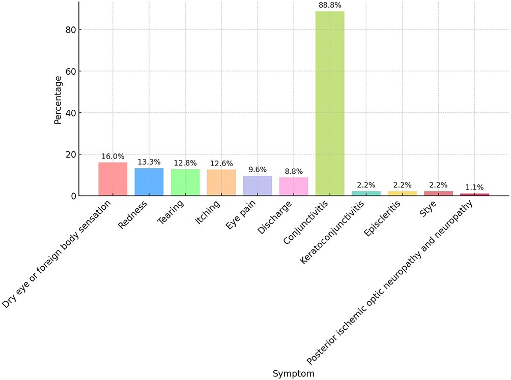 2) COVID-19 can cause various ocular symptoms including conjunctivitis, keratitis, scleritis, uveitis, retinal changes, and neurological involvement. Common early symptoms are conjunctivitis and eye pain.