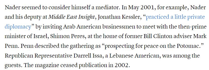 In May 2001, Nader and Kessler arranged a meeting at the home of political consultant Mark Penn between Arab American businessmen and then-Prime Minister of Israel, Shimon Peres. web.archive.org/web/2018030905…