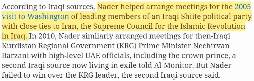 Nader worked his way into a position of influence in the administration of Iraqi Prime Minister Nouri al-Maliki. When al-Maliki's term in office ended in 2014, Nader moved on to the UAE. web.archive.org/web/2021041203…