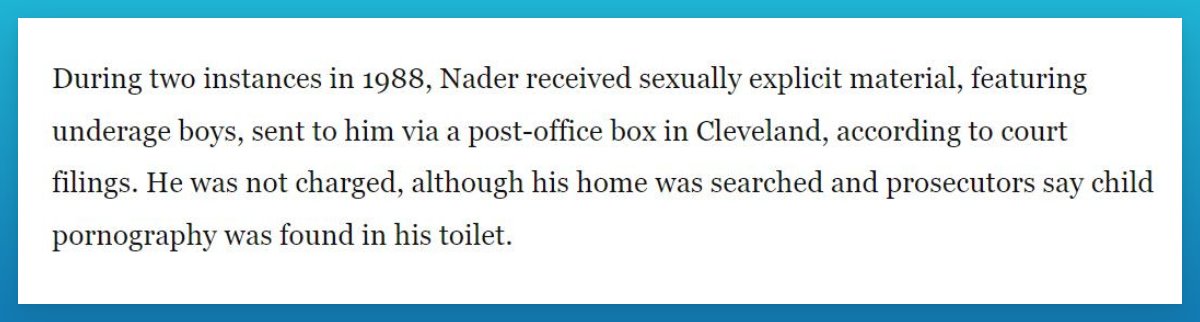 In 1988, Nader was once again investigated for possessing child pornography, and once again he wasn't charged despite sexually explicit material being found "in his toilet." web.archive.org/web/2018031703…