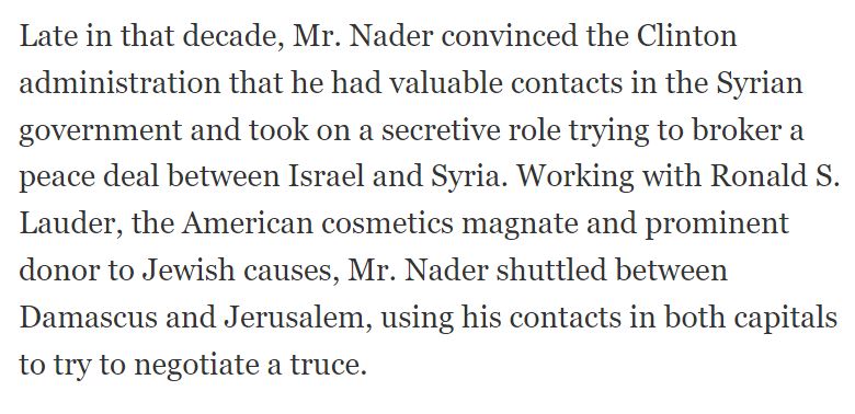 In the late 90's, Nader facilitated back-channel Syria-Israel negotiations, conveying Syrian views while cosmetic tycoon Ronald Lauder represented Israeli positions.