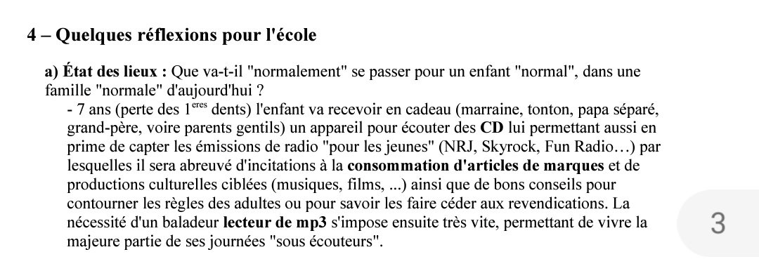 Bon, le truc date de 2013, le mp3 et le baladeur CD, c'est un peu has been mais on note particulièrement dans ce passage une hostilité envers le monde extérieur et même la culture qui nuirait au dvp des enfants 👇